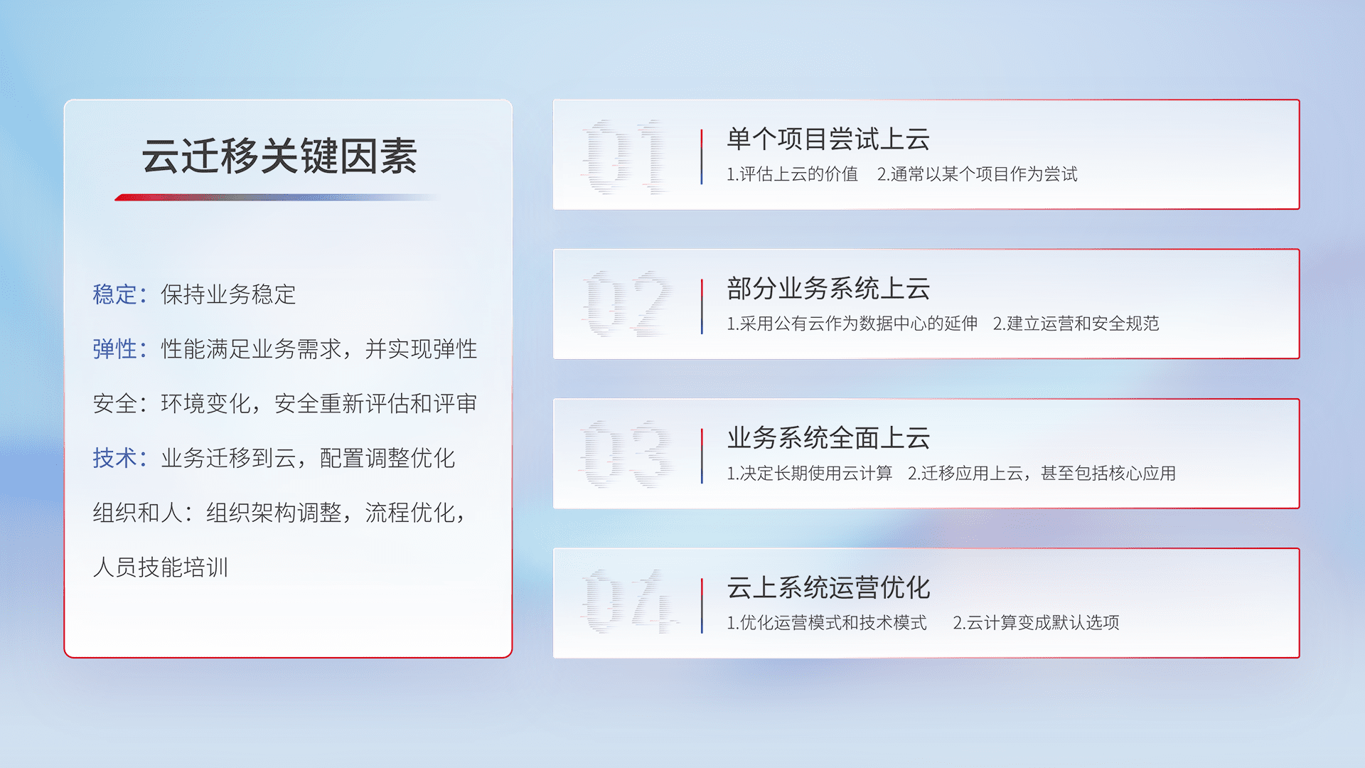 结合实际业务,,,从规划设计、、云平台选型、、云原生改造、、、、数据迁移、、、集成交付,,,,迁移全过程为客户识别最佳上云路径,,,做好风险识别管理,,,,设计网络架构、、身份权限、、、安全审计合规、、操作审计、、日志审计、、、、监控告警策略、、、多站点容灾设计等,,,,对云上基础设施进行整体规划,,,,提升IT治理水平,,以满足弹性、、、高可用、、高性能的需求。。